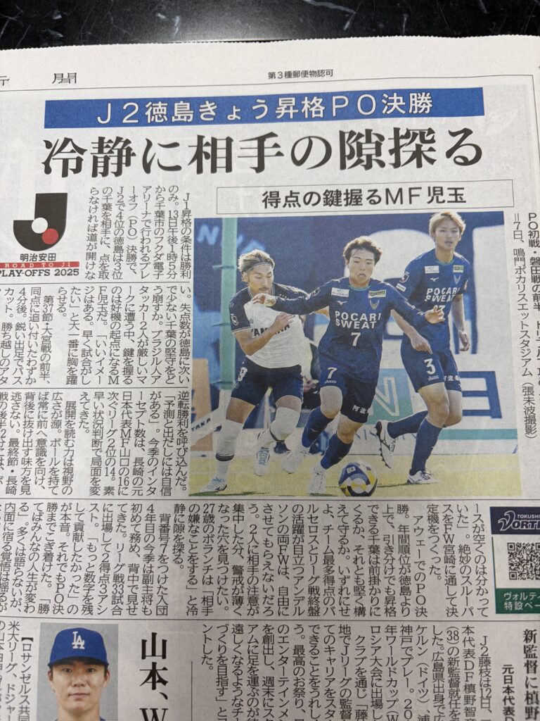 HOME > 投稿-稔ブログ > いよいよ 2025年12月13日 本日13:00キックオフです。 仕事中なのでリアルタイムでTVで応援はできませんが、心の中で全力で応援したいと思っています。 勝ってください! ボルティス徳島!! ※写真は今朝の徳島新聞から -