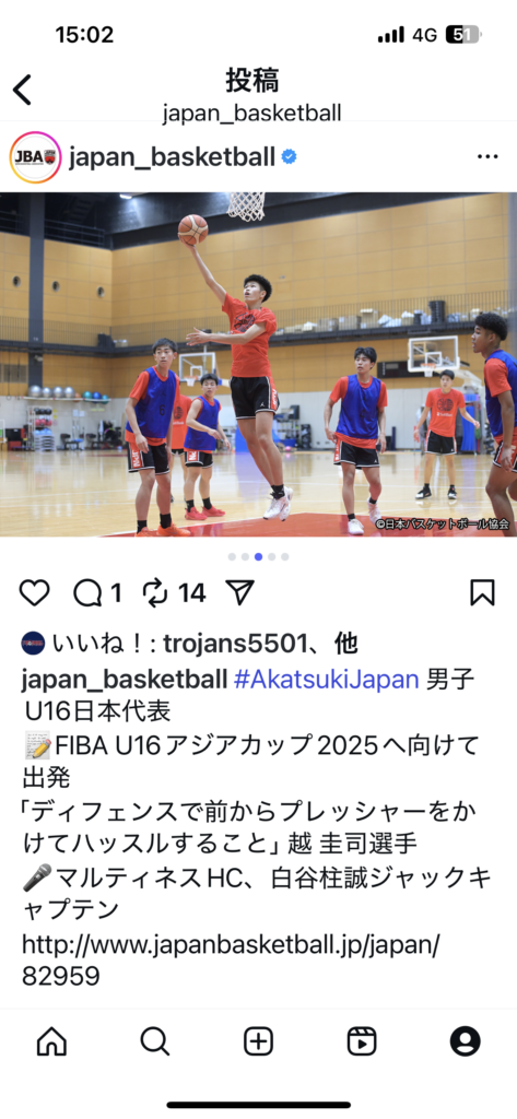 少し前ですが、U16の男子バスケ代表に徳島県から中3で唯一平岡選手が選出されています。