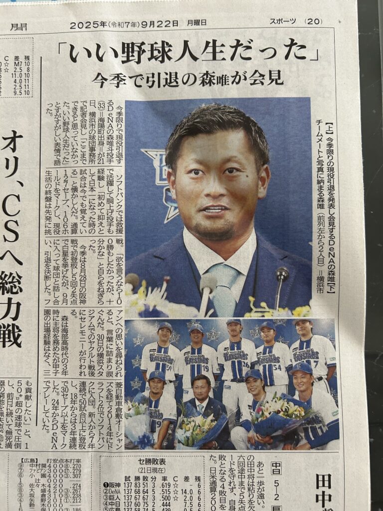 今朝の徳島新聞に、DeNAの森投手の今季かぎりの引退が発表されました。
